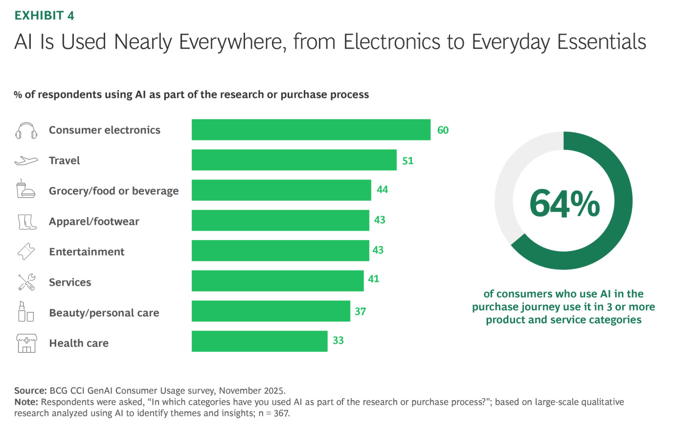 AI consumer behaviors: Among US adults who use AI as part of the purchase journey, 60% research or plan electronics purchases with the help of AI, according to BCG. That usage rate was higher than any other category BCG studied. An August 2025 study by McKinsey backs this up; it found that 55% of AI platforms users used AI to learn about or make decisions about consumer electronics purchases in the past 3 months before the survey.