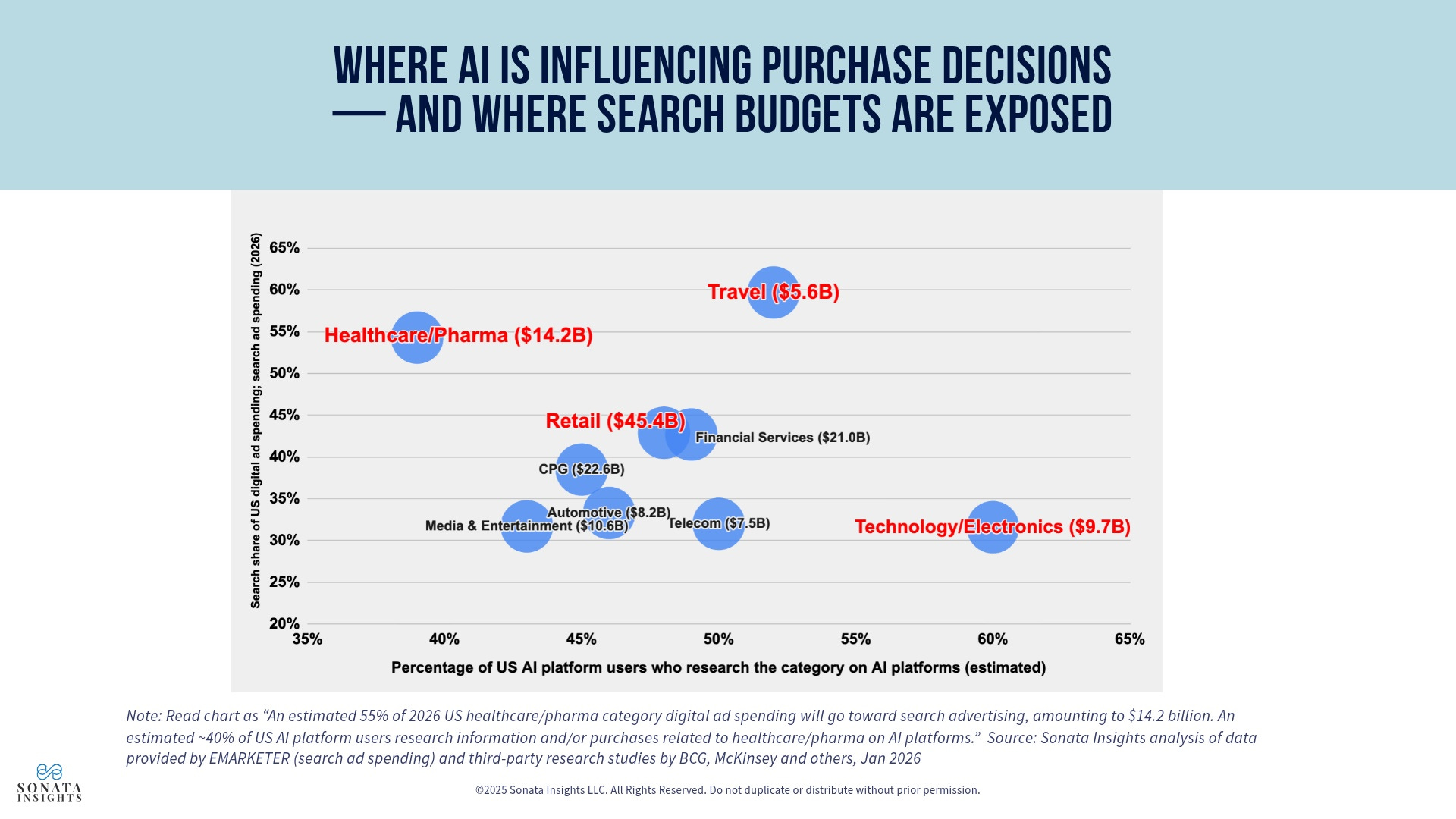 Technology/electronics advertisers are much less reliant on search advertising than travel, retail or healthcare/pharma advertisers, allocating an estimated 32% of 2026 digital ad budgets to search, for a total of $9.65 billion in spending. But consumer AI usage is higher than in any other category, indicating that advertisers should act now to boost organic presence in AI, while simultaneously starting to invest in AI media to capture existing consumer demand.