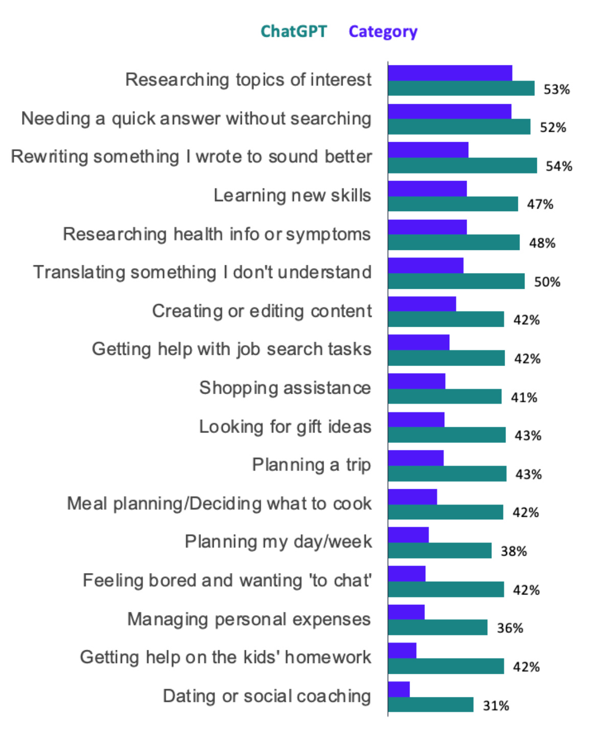 New data from Morning Consult shows that US adults are significantly more likely to use ChatGPT than other AI platforms as a category for every task asked about.